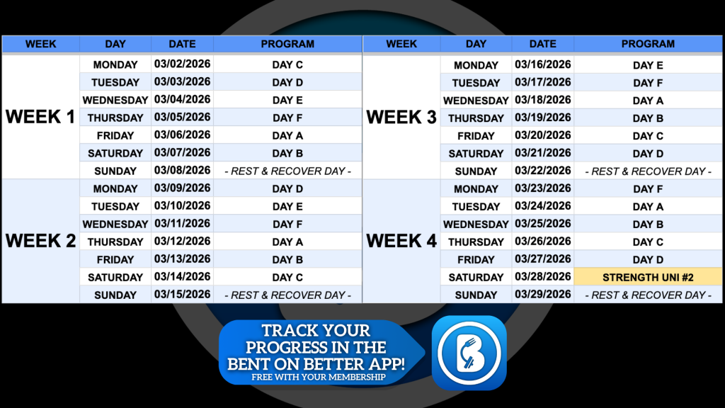 March month at a glance Daily S.G.P.T. Workout PLAN Day (A) Day (B) Day (c) Day (D) Day (E) Day (F) Click here to review the complete Bent On Better Calendar of events Helpful Article Click here Helpful Article or freebie Click here Helpful Videos Video 1 with link Video 1 with link Video 1 with link Video 1 with link Link to online program –> Shop Now