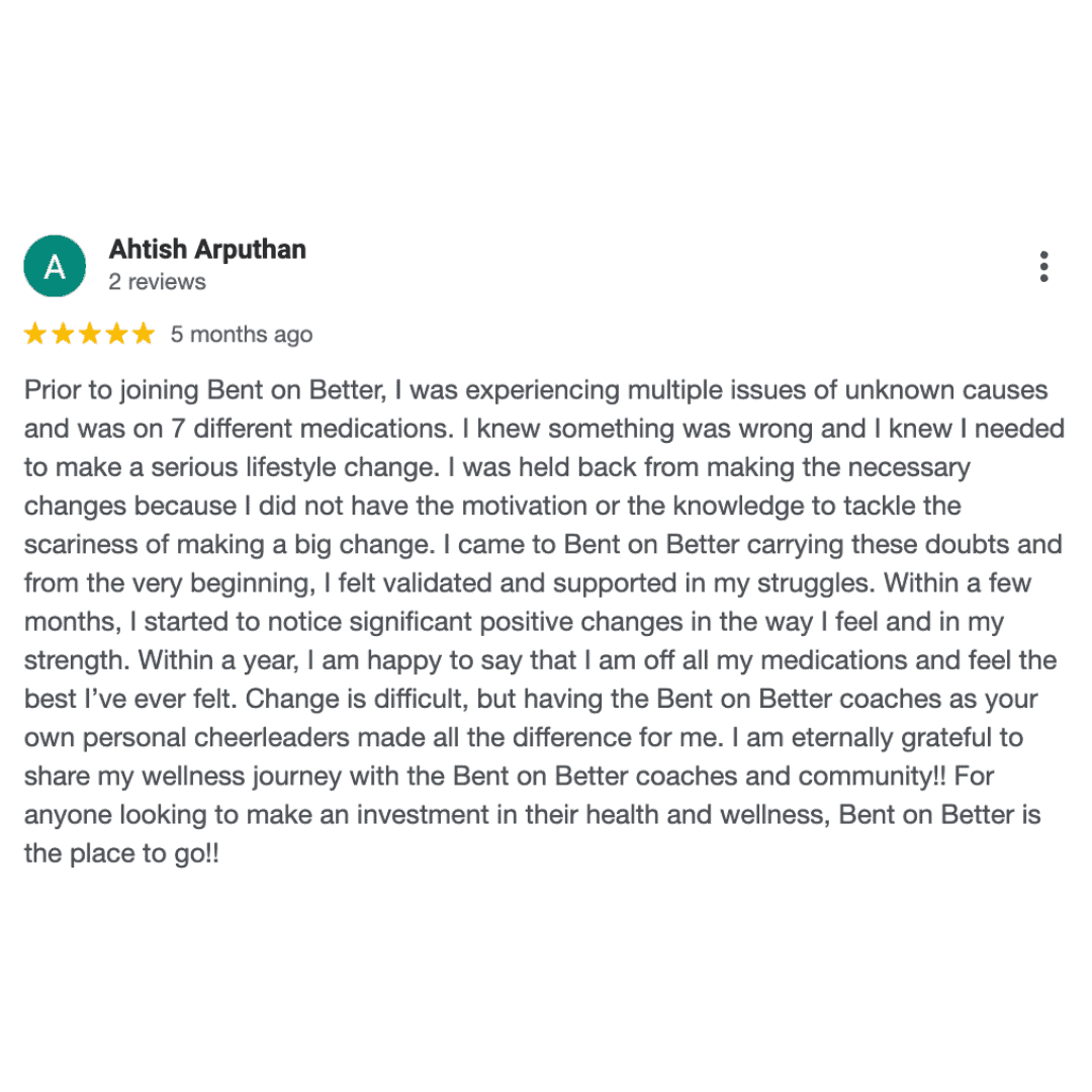 Prior to joining Bent on Better, I was experiencing multiple issues of unknown causes and was on 7 different medications.
