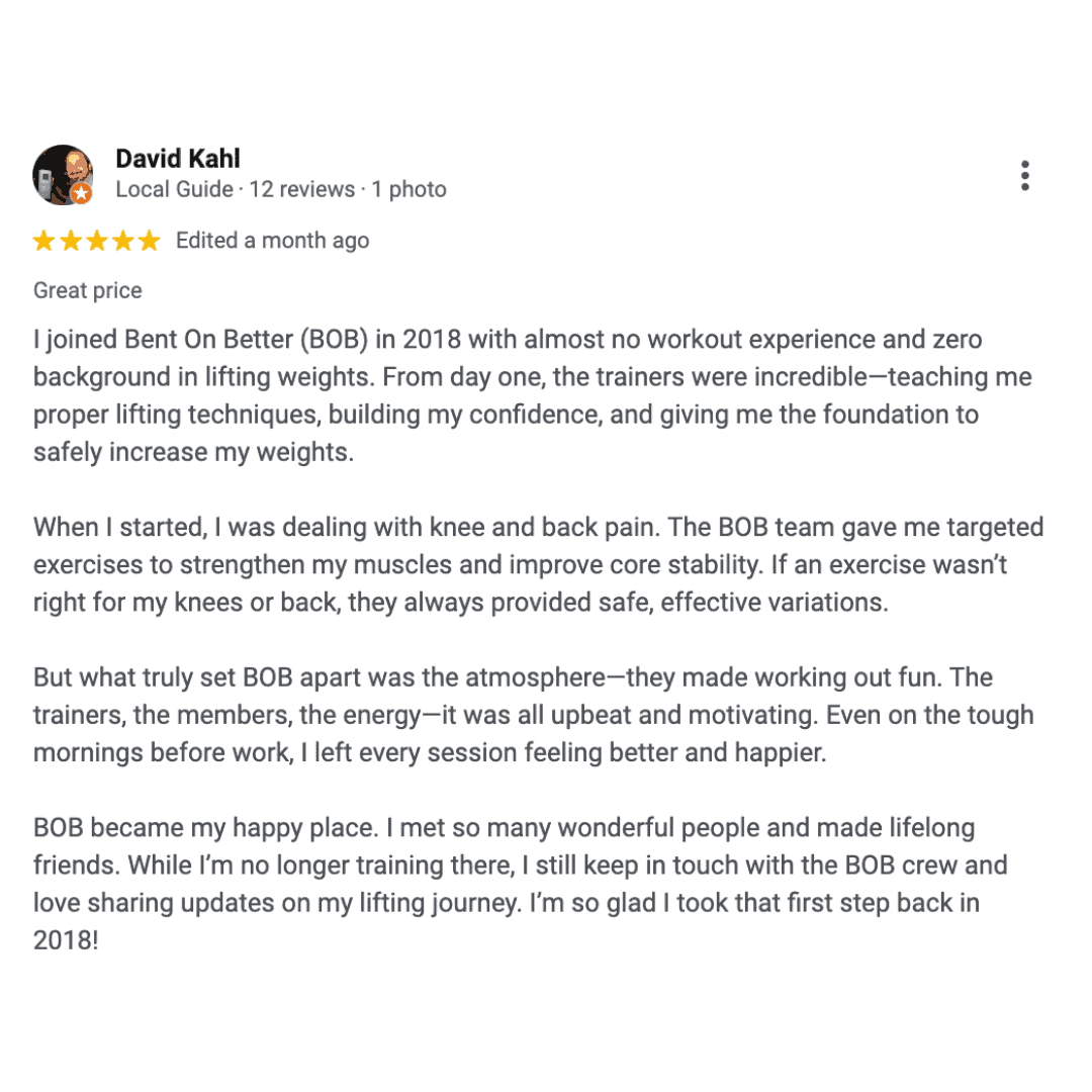 I joined Bent On Better (BOB) in 2018 with almost no workout experience and zero background in lifting weights.