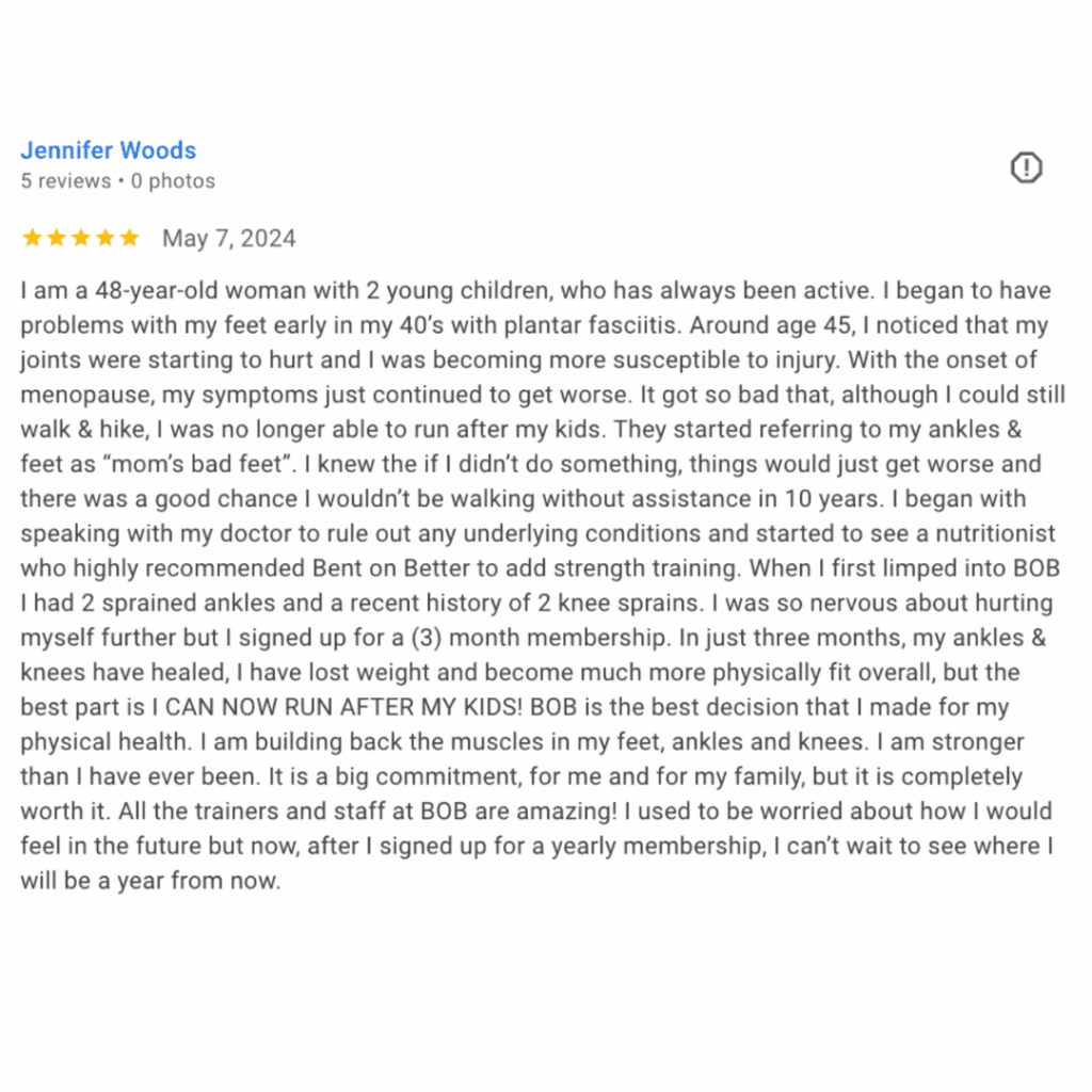 I began with speaking with my doctor to rule out any underlying conditions and started to see a nutritionist who highly recommended Bent on Better to add strength training.
