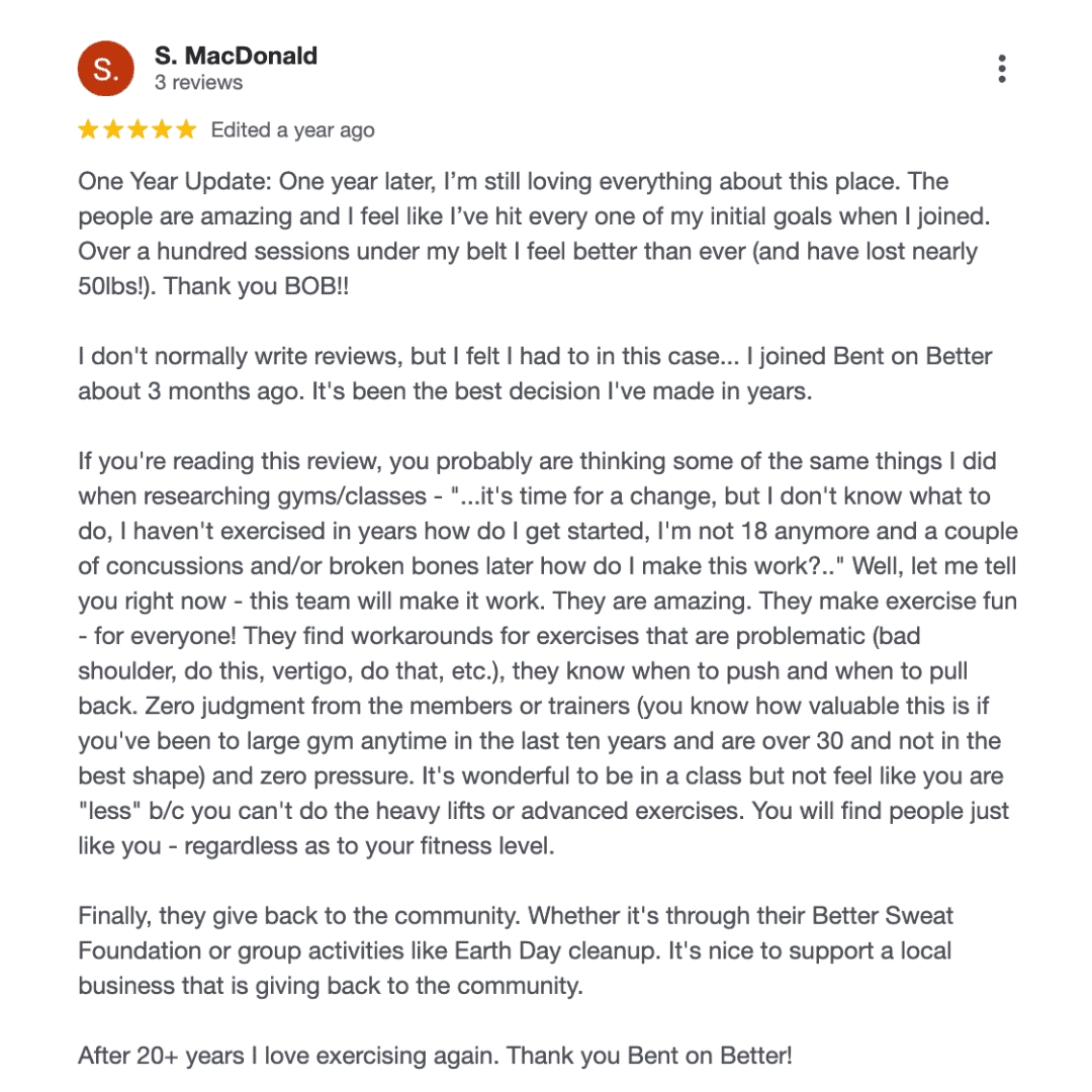 After 20+ years, I love exercising again. Thank you Bent on Better!