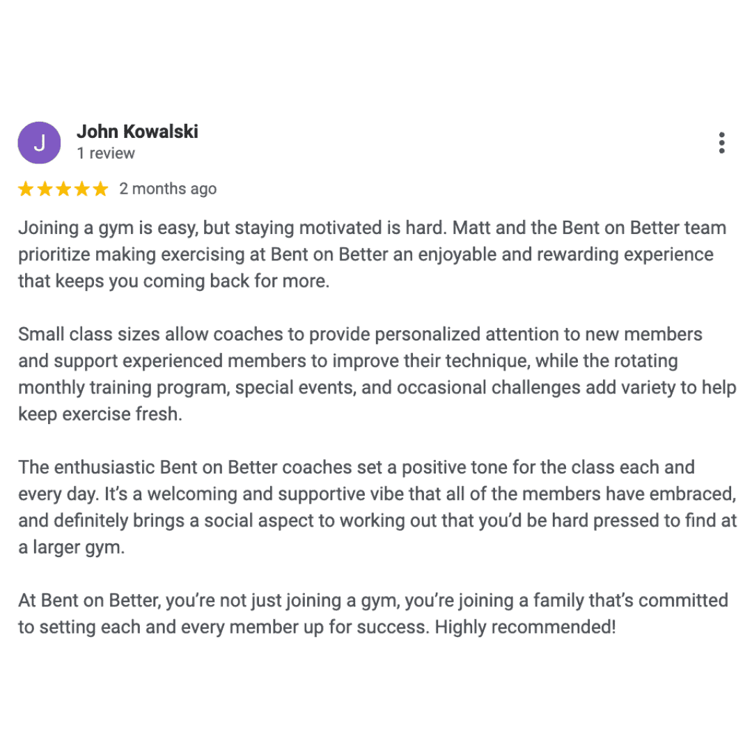 At Bent on Better, you’re not just joining a gym, you’re joining a family that’s committed to setting each and every member up for success.